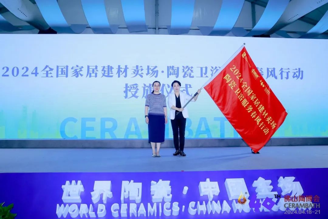 為進(jìn)一步助力經(jīng)銷商轉(zhuǎn)型升級與發(fā)展,提供更加優(yōu)質(zhì)與系統(tǒng)性服務(wù),佛山陶博會與中國建筑材料流通協(xié)會家居市場專委會聯(lián)手,推出“2024全國家居建材賣場·陶瓷衛(wèi)浴服務(wù)春風(fēng)行動”。在開幕式現(xiàn)場,中國建筑材料流通協(xié)會副會長兼常務(wù)秘書長、家居建材市場專委會主席張彩虹向佛山中陶城集團(tuán)副總裁、中國陶瓷衛(wèi)浴總部總經(jīng)理、中國淄博陶瓷總部總經(jīng)理湯潔明授予旗幟。